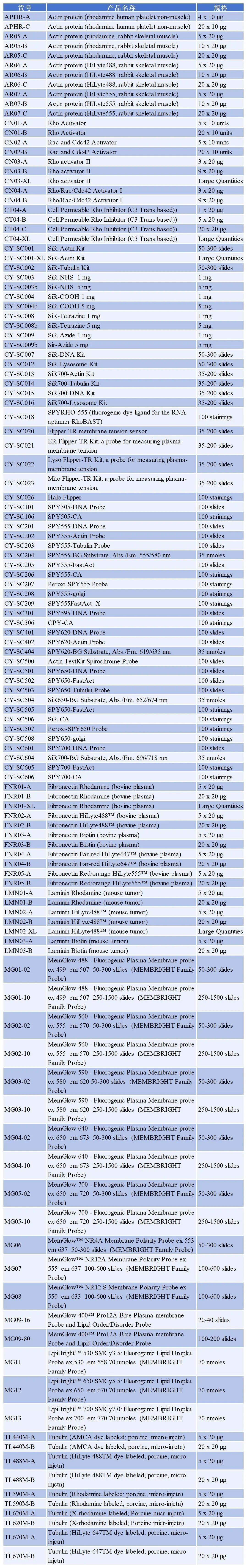 Spirochrome 开发的 SiR-、SPY-、PK- 和 Flipper-TR 活细胞成像探针是细胞渗透性化合物,可标记活细胞中的微管、F-肌动蛋白、溶酶体、膜、线粒体和染色体 DNA。SPY™ 探针改进了 SiR 活细胞成像技术,同时还扩展了荧光团标记选项,用于研究活细胞中的 F-肌动蛋白、微管和 DNA。